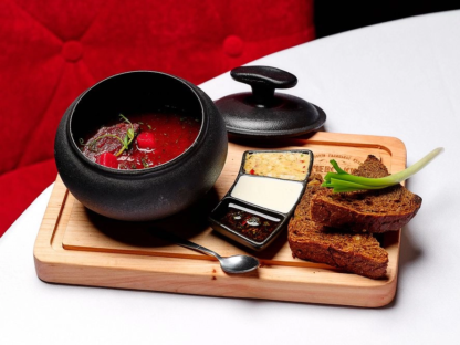 Традиційно смачний борщ на копчених ребрах, яловичому бульйоні з копченою грушею та буряковій заквасці.