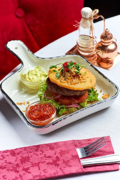 Галицька варіація всесвітньовідомого гамбургера. Cоковита котлета з фермерської яловичини з овочами, соусами тартаром та аджикою між двома хрумкими дерунами. 250/60г